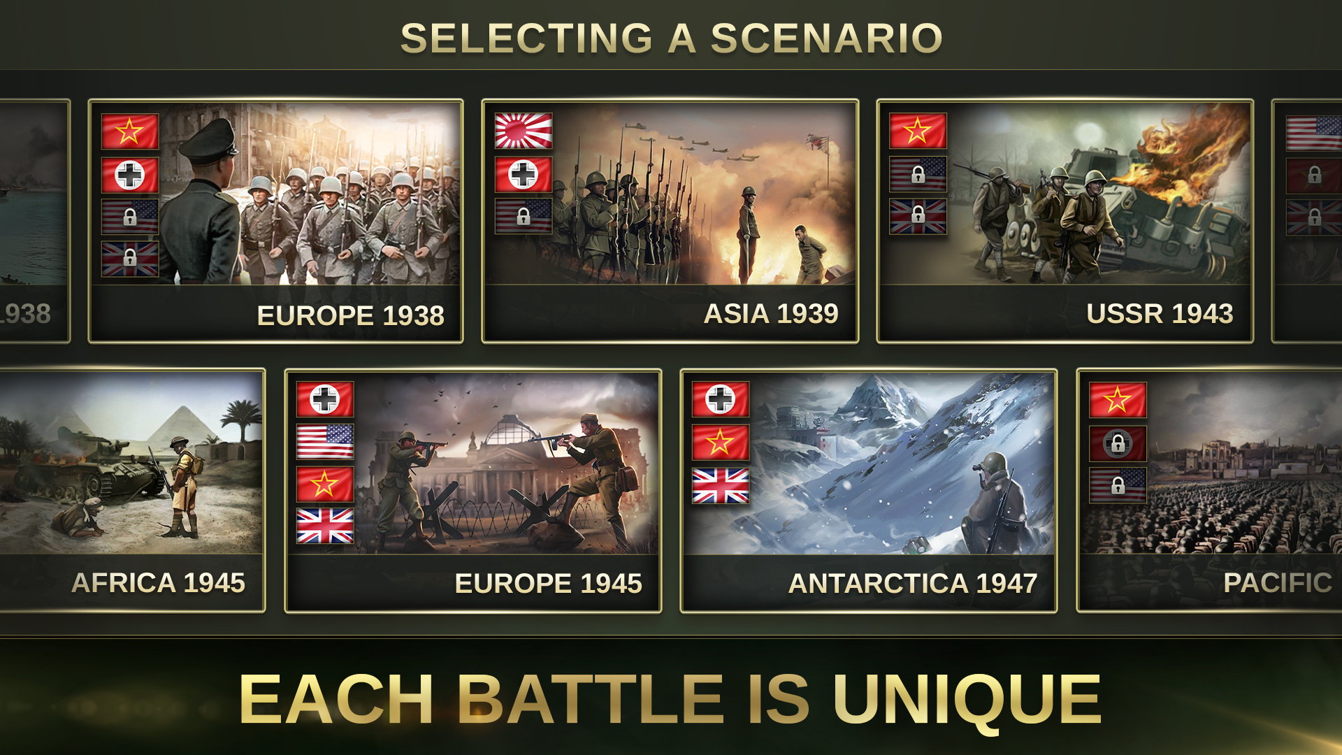 - Разнообразные сценарии - эта историческая игра предлагает сразиться с разными противниками, на разных континентах и с разными условиями.