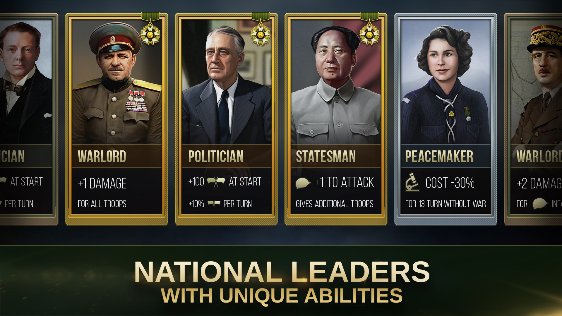 Как глава государства ты будешь выбирать лидеров для своего народа. Тебе решать, кого назначать: генералов, ученых, политиков или даже писателей. Каждый лидер даст собственный бонус и повлияет на тактику игры.