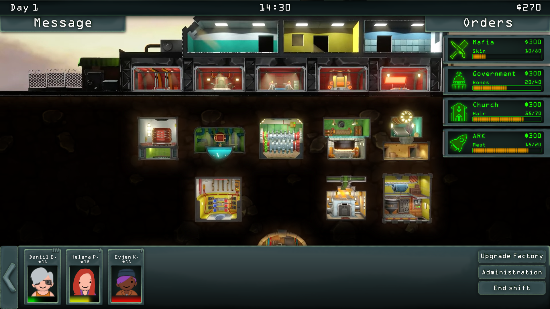 - Открывай новые цеха, строй помещения под нужды сотрудников и улучшай исследовательский центр. Ресурсы не бесконечны, так что постарайся, чтобы всё не развалилось до запуска ковчега.