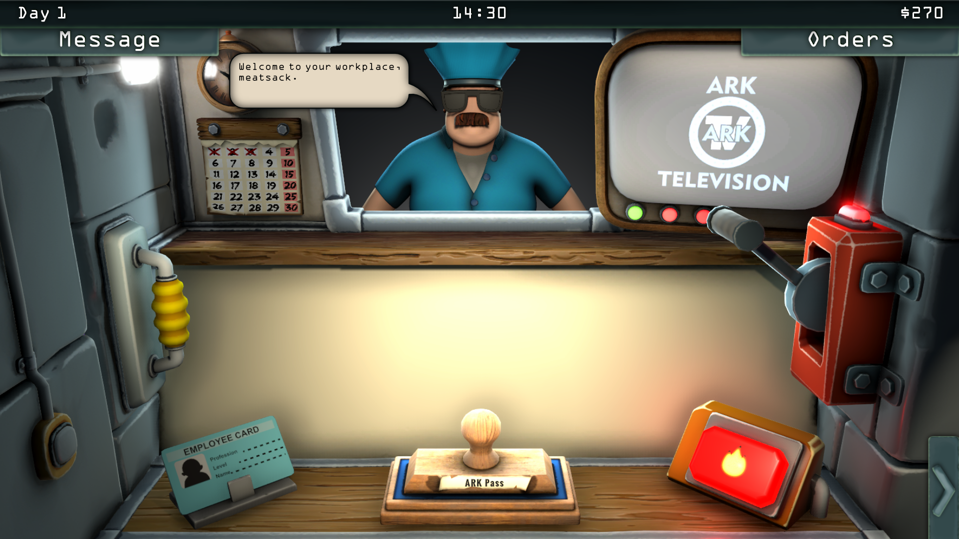 - Контролируй очередь, досматривай посетителей и выбирай место для каждого — пахать на заводе, стать топливом или отдать свои кровь и пот на благо будущего. Буквально.